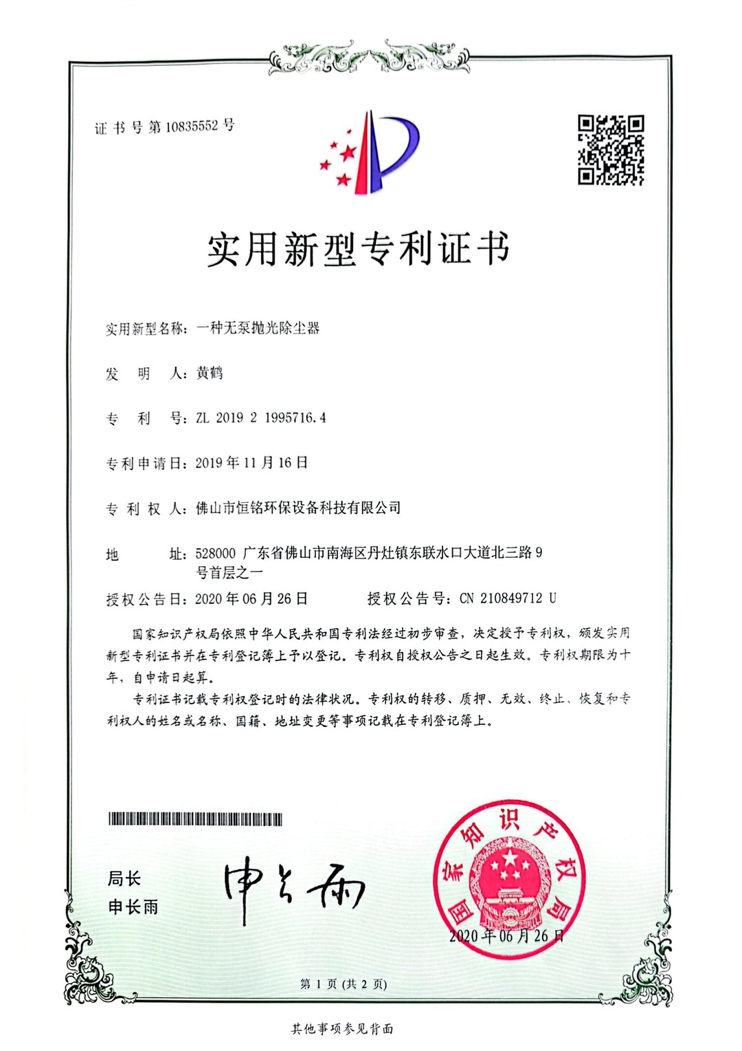 实用新型专利证书
