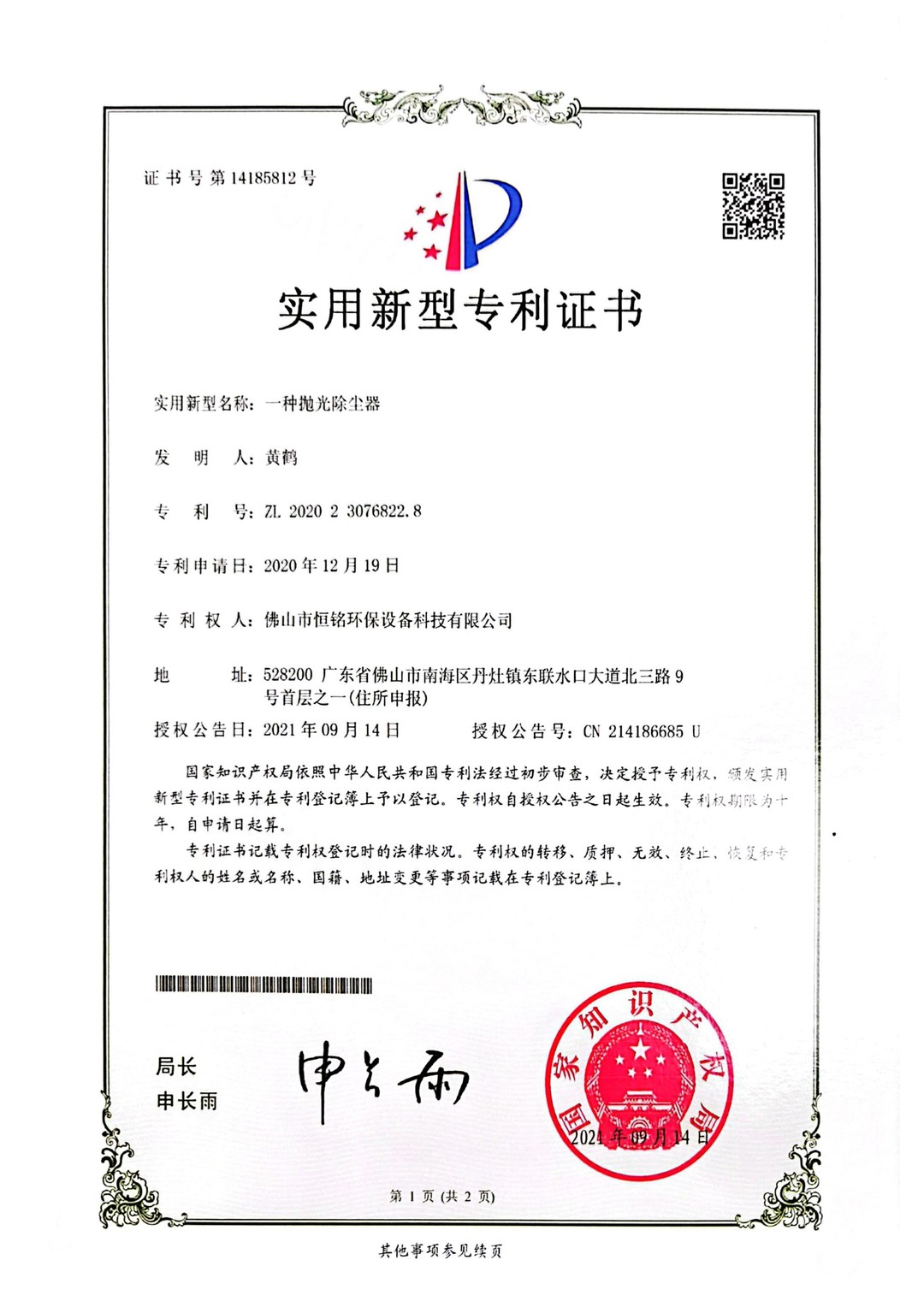 实用新型专利证书