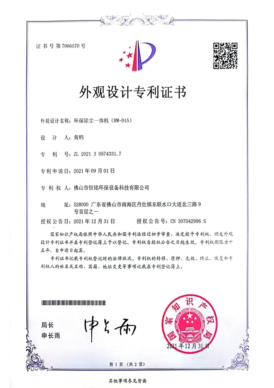外观设计专利证书